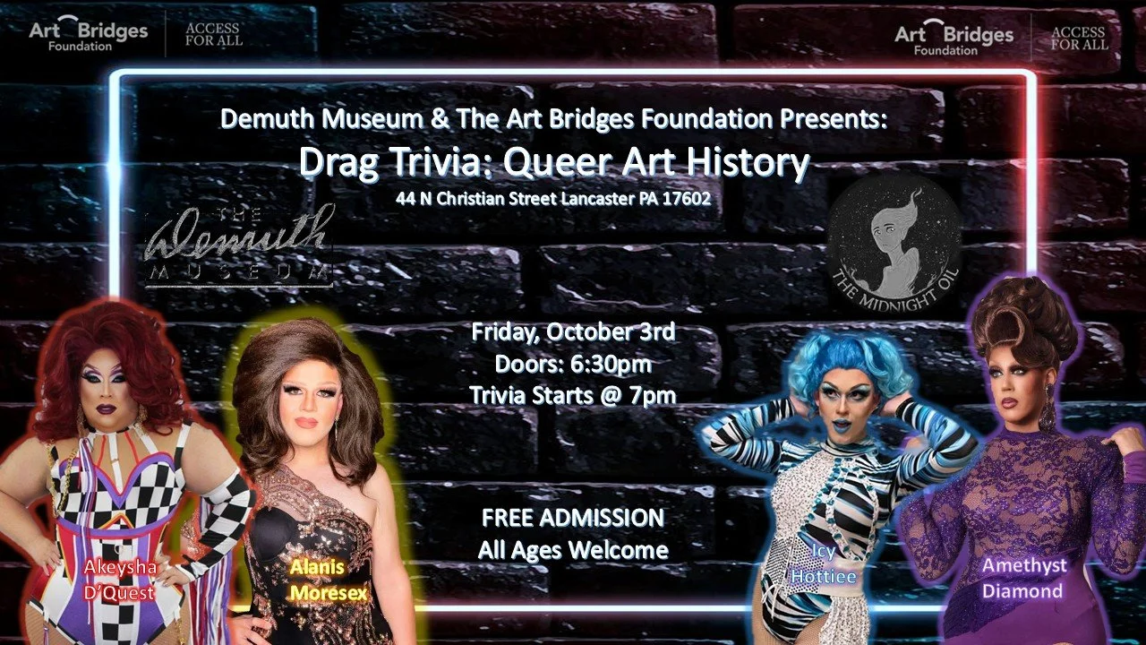 Celebrate LGBTQ+ History Month this October with Drag Trivia: Queer Art History at the Midnight Oil! Join Icy Hottiee, Amethyst Diamond, Alanis Moresex, and Akeysha D’Quest for an evening of trivia, drag performances, and community! Stop by the Demuth Museum (open 10 am - 8 pm) before trivia begins to learn all about Charles Demuth and his friends from the early-20th century artistic queer community. (This might give you an edge on the trivia competition!)